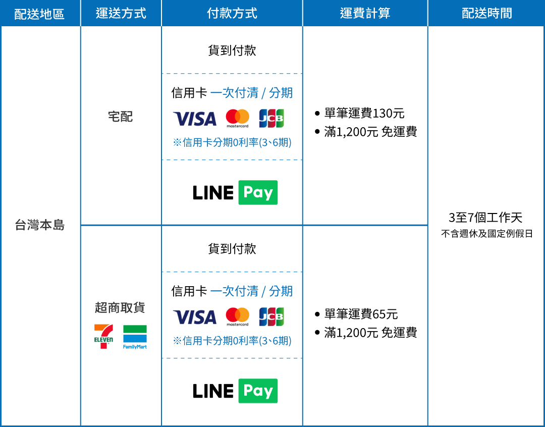 • 付款方式有「信用卡一次付款」、「信用卡分期付款」、「 7-11 取貨付款」、「全家 取貨付款」、「宅配貨到付款」「Line Pay」詳細說明請見「付款及退貨」