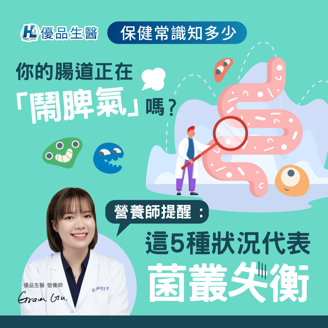 別以為腸道只是負責消化! 它其實是人體的「第二個大腦」,更是免疫力與代謝的關鍵中樞。研究指出,腸道菌叢的健康,和人體整體健康成正比。 當「好菌」與「壞菌」比例失衡,也就是出現「菌叢失衡」時,身體會透過各種小狀況發出警訊。營養師整理出5個常見的腸道求救訊號,看看你中了幾個? 目錄什麼是「腸道菌叢失衡」?注意!菌叢失衡的5大求救訊號消化不順(脹氣、排便不規律)皮膚狀態不穩(搔癢、痘痘)情緒波動與腦霧免疫力下降、容易感冒持續性疲倦感三步驟,養回腸道「好菌」大軍多吃天然發酵食物餵好菌吃纖維打造好菌的生活環境營養師小結:菌叢健康=全身健康 什麼是「腸道菌叢失衡」?腸道就像一座微型生態圈,裡面住著數以兆計的菌群—— 有幫忙維持平衡的「好菌」、也有搗亂的「壞菌」。✅ 健康狀態:好菌佔優勢,壞菌被抑制,整體平衡穩定。 ❌ 菌叢失衡:飲食油膩、壓力大、熬夜、亂吃加工食物,都可能讓壞菌增生、好菌減少,腸道功能就會失序。注意!這5種狀況代表菌叢可能失衡1️⃣ 消化不順(脹氣、排便不規律) 壞菌在腸道產氣太多,容易出現脹氣、放屁、便秘或腹瀉等症狀。2️⃣ 皮膚反覆出狀況(搔癢、痘痘、乾燥) 腸道發炎也會導致皮膚防禦力降低,讓皮膚變敏感、乾癢或長痘痘。3️⃣ 情緒低落、思緒不清 大部分的快樂荷爾蒙「血清素」由腸道產生。因此腸道菌叢混亂時,也容易出現焦慮、煩躁或有「腦霧感」。4️⃣ 容易感冒、過敏反覆 腸道有非常大面積的黏膜組織,七成免疫細胞都集中在這。菌叢失衡會削弱免疫防線,給病源體入侵的機會。5️⃣ 長期疲倦、睡再多也沒精神 腸道若慢性發炎、營養吸收不良,也會讓人人容易疲倦。 三步驟,養回腸道「好菌」大軍出現以上症狀怎麼辦? 別怕!腸道健康是可以「養」回來的! 只要從飲食與生活習慣調整開始,好菌就能重新回歸。步驟一:多吃天然發酵食物 發酵食物是最天然的好菌來源。 📌 建議選擇:無糖優格、泡菜、味噌湯、豆腐乳、康普茶 👉 避免過甜或過鹹的產品,才能真正幫助好菌。步驟二:餵好菌吃纖維 蔬菜、水果與全穀類中的膳食纖維,就是好菌的能量來源。 📌 多放進餐盤的食材:奇異果、蘋果、蘆筍、香蕉、深綠色蔬菜、燕麥 👉 每餐多點蔬果、主食換成糙米或燕麥,從日常飲食養成好菌。步驟三:打造好菌的生活環境 壓力、睡眠與運動,都會影響菌叢平衡。 📌 三個習慣開始做:規律作息、別熬夜每天動一動,飯後散步或快走30分鐘多喝水、細嚼慢嚥、放慢生活節奏 營養師:菌叢健康=全身健康腸道健康幾乎牽動全身—— 從消化順暢、皮膚穩定,到精神狀態與免疫力,都與菌叢健康息息相關。時刻記得:你的菌叢有多健康,你的人就有多健康。從今天開始,吃得天然、睡得規律、心情放鬆, 讓好菌回家,身體自然更有活力。 延伸閱讀早上該選B群 or 咖啡,營養師:這樣選最聰明營養師破解三大補鐵迷思,找回紅潤好氣色!